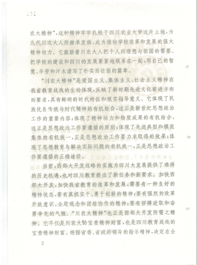 因此,从这一意义来看,今日川农大的不平凡正是源自于宝贵的“川农大精神”,而“川农大精神”之所以是宝贵的,首先是因为她薪火相传式的如缕不绝,是因为“这种精神牢牢扎根于四川农业大学这片土地,为几代川农大人所继承发扬,成为推动学校改革和发展的强大精神动力。”其次,“川农大精神”的宝贵之处还在于她从不局限于一己之私或一隅之狭,而是长期“激励着川农大人把个人的理想与祖国的需要、 把学校的建设和四川的发展紧紧地联系在一起,用自已的智慧、辛劳和汗水谱写了朴实而壮丽的篇章。”