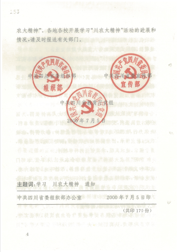 引子:2000年7月5日,中共四川省委组织部、中共四川省委宣传部、中共四川省教育厅党组联合下发《关于学习“川农大精神”的通知》(以下简称《通知》),《通知》作为20年前“川农大精神”正式得以命名的标志性文献之一,在号召全省各高校、各市州、各地方教育系统开展学习“川农大精神”活动的同时,首次明确回答了什么是“川农大精神”和怎样学习“川农大精神”这一根本问题。新时代背景下,本文借对《通知》的重温学习,重启关于“川农大精神”新时代内涵和如何继承弘扬好新时代“川农大精神”的时政理论思考。