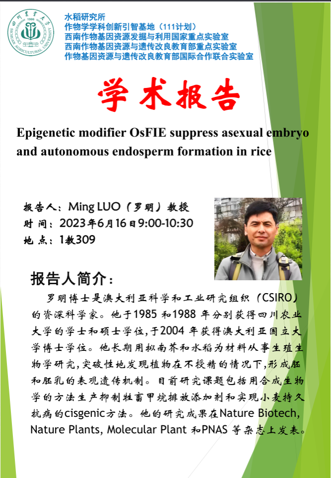 学术报告—表观遗传修饰子OsFIE抑制水稻中无性胚和胚乳的自主发育