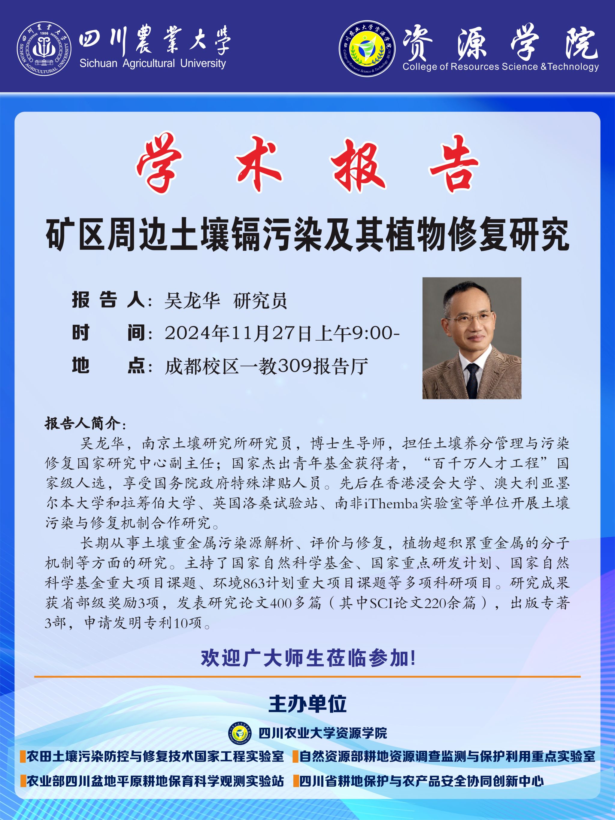 资源学院学术报告:矿区周边土壤镉污染及其植物修复研究