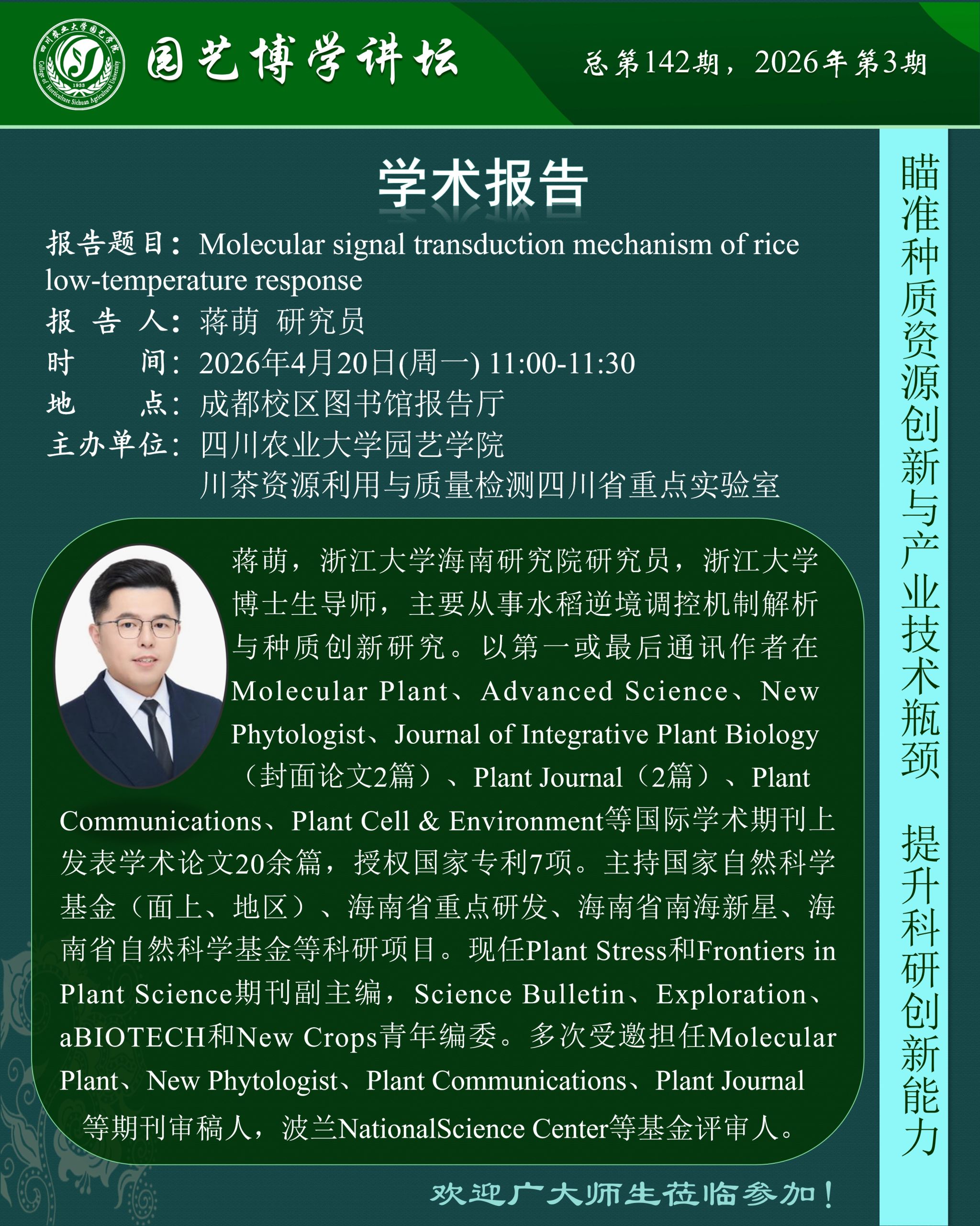 园艺博学讲坛——Molecular signal transduction mechanism of rice low-temperature response